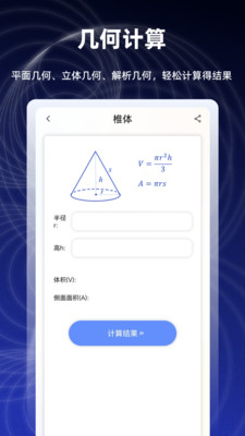 数学函数图形计算器帮助用户计算出数学难题,应用提供平面几何计算、立体几何计算、解析几何等等计算功能!