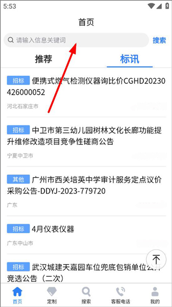 1、打开招标网app,主要有首页、定制、搜索、客服电话、我的等版块,在上方搜索框输入关键词或者点击下方搜索;