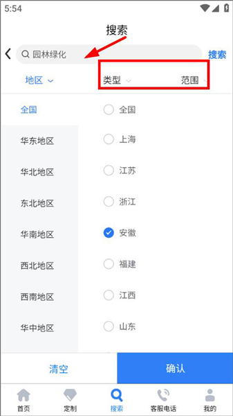 2、输入关键词,选择地区、类型和范围,点击确认;