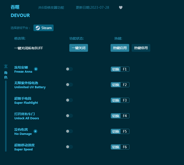 《吞噬Devour》是一款多人恐怖生存游戏,逃离恶鬼,不然会被拖入地狱。使用这款《吞噬Devour修改器》能够拥有超级手电筒,冻结安娜,无限电池,没有伤害,打开车门等游戏辅助,帮助玩家游戏更轻松,顺利通关!感兴趣的朋友不要错过,六蓝游戏网推荐大家下载体验!