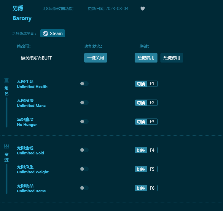 《男爵Barony》是一款非常困难的硬核的地牢游戏。使用这款《男爵Barony修改器》获得无限生命,无限魔法,无限金钱,无限负重,满饱腹度,无限物品等强力游戏辅助,帮助玩家降低游戏难度,游戏战斗更爽快!感兴趣的朋友不要错过,六蓝游戏网推荐大家下载体验!