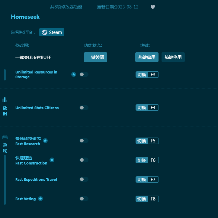 5、等待显示“BUFF加持成功”后,我们就可以在Homeseek游戏中使用按键来快速激活和关闭对应的修改器功能了