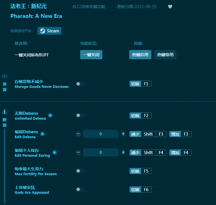 《法老王新纪元》是一款传奇城市建设模拟游戏,玩家成为法老王建设伟大的城市。这款《法老王新纪元修改器》专为游戏玩家设计,内置无限货物,最大生育力,上帝被安抚,上帝总是祝福等二十二项全能游戏辅助,帮助玩家建设城市,游戏体验更佳!感兴趣的朋友不要错过,六蓝游戏网推荐大家下载体验!