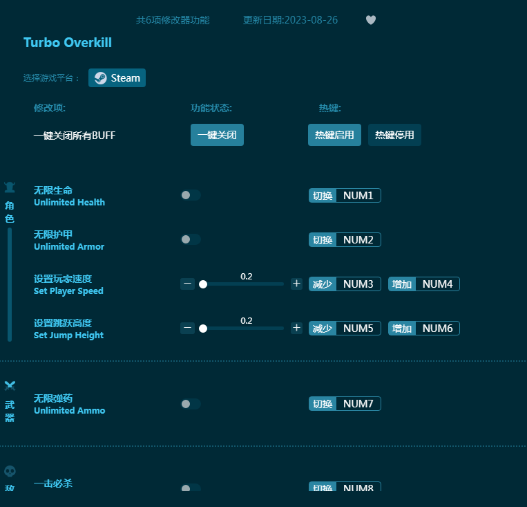 《Turbo Overkil》是一款赛博朋克风的科幻射击游戏,超快节奏爽射。搭配这款《Turbo Overkil修改器》提供的无限生命,无限护甲,无限弹药,一击必杀,跳跃高度等等,让游戏体验更爽,玩家游戏节奏更刺激!感兴趣的朋友不要错过,六蓝游戏网推荐大家下载体验!