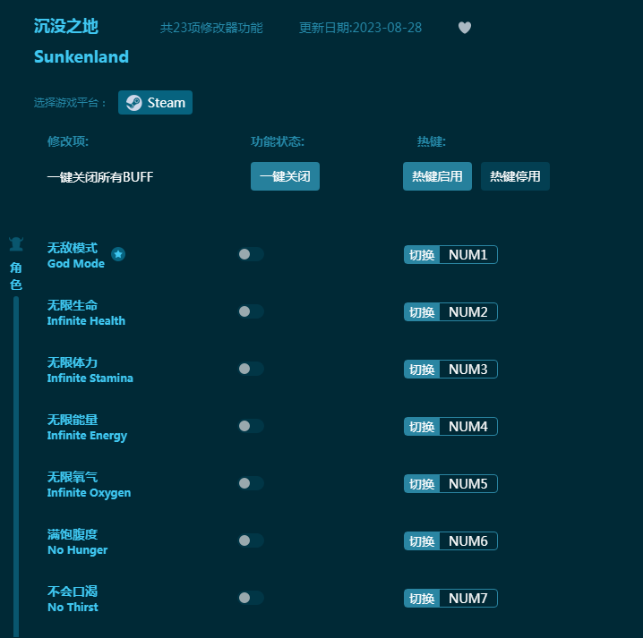 《沉没之地》是一款末日求生游戏,被洪水淹没的地球,你该怎么生存。六蓝游戏网带来《沉没之地修改器》能为玩家提供二十三项全能游戏辅助,包括无敌模式,无限生命,无限体力,无限能量,无限氧气,满饱腹度等等,玩家使用后,游戏中水中探索战斗更刺激!感兴趣的朋友不要错过,六蓝游戏网推荐大家下载体验!