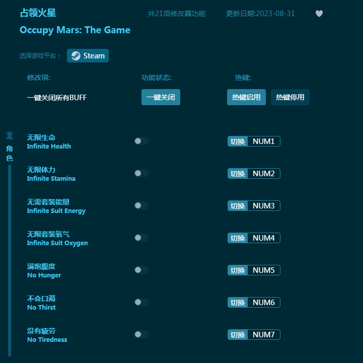 《占领火星修改器》为游戏《占领火星》带来全能二十一项游戏修改功能,帮助玩家获得更对游戏帮助。内置无限生命,无限体力,无需套装能量,无限套装氧气,满饱腹度,不会口渴,没有疲劳等等,让玩家游戏体验更爽快!感兴趣的朋友不要错过,六蓝游戏网推荐大家下载体验!
