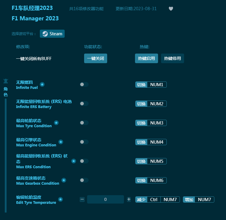 5、等待显示“BUFF加持成功”后,我们就可以在F1车队经理游戏中使用按键来快速激活和关闭对应的修改器功能了