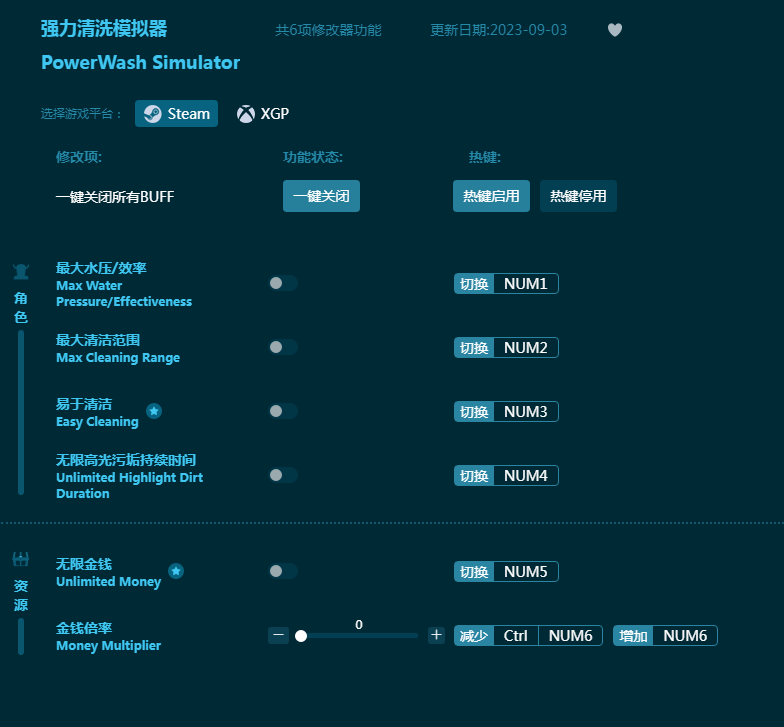 《强力清洗模拟器修改器》为游戏《强力清洗模拟器》设计出品,这是一款轻松休闲解压的清洗游戏,将游戏中的垃圾脏东西全部洗干净。而这款《强力清洗模拟器修改器》为玩家提供最大水压,最大清洁范围,易清洁,无限金钱等修改功能,让游戏更爽快舒适,特别解压!感兴趣的朋友不要错过,六蓝游戏网推荐大家下载体验!