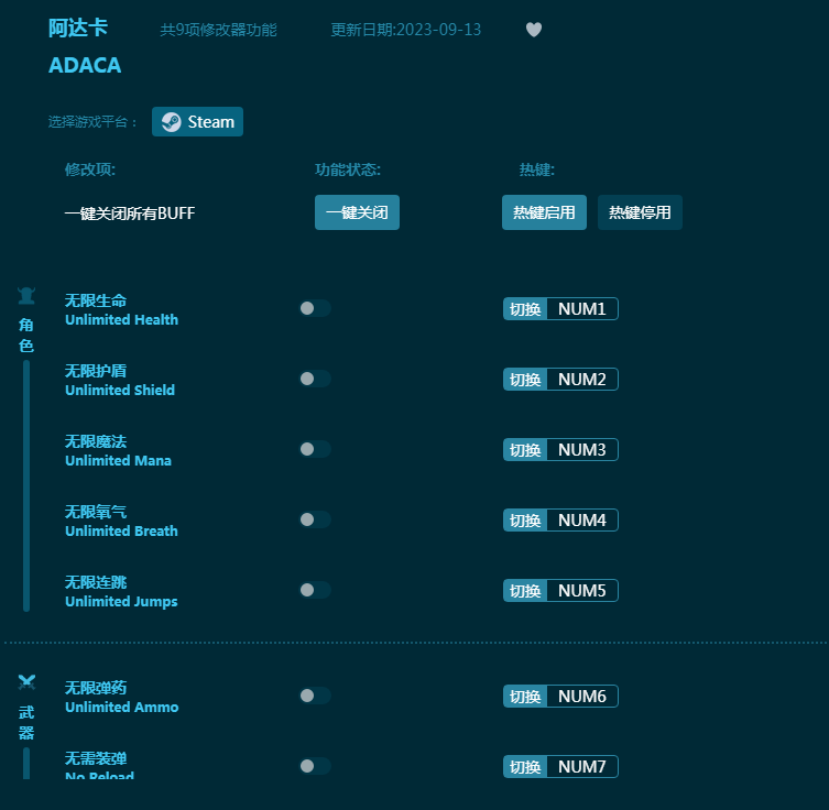 《阿达卡》是一款科幻射击游戏,使用各种武器装备和敌人战斗。这款《阿达卡修改器》为玩家提供九项修改功能,包括无限生命,无限护盾,无限魔法,无限氧气,无限连跳,无限弹药等等,帮助玩家游戏更爽快,享受射击乐趣!感兴趣的朋友不要错过,六蓝游戏网推荐大家下载体验!