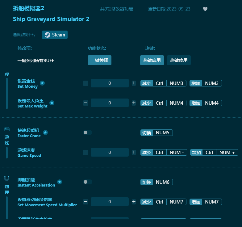 《拆船模拟器2修改器》是为同名游戏打造的最新款修改工具,这里有:没有负重,无限金钱,最大负重,快速起重机,立即摧毁连接器,即时加速等丰富强力的修改功能。玩家可自由选择使用,帮助玩家通过难关,游戏更有趣!感兴趣的朋友不要错过,六蓝游戏网推荐大家下载体验!