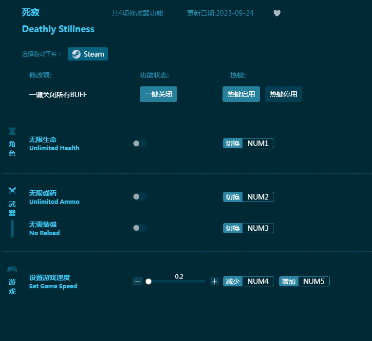4、先运行“死寂”游戏再运行修改器,游戏运行后点击右侧的“加个BUFF”按钮激活修改器。
