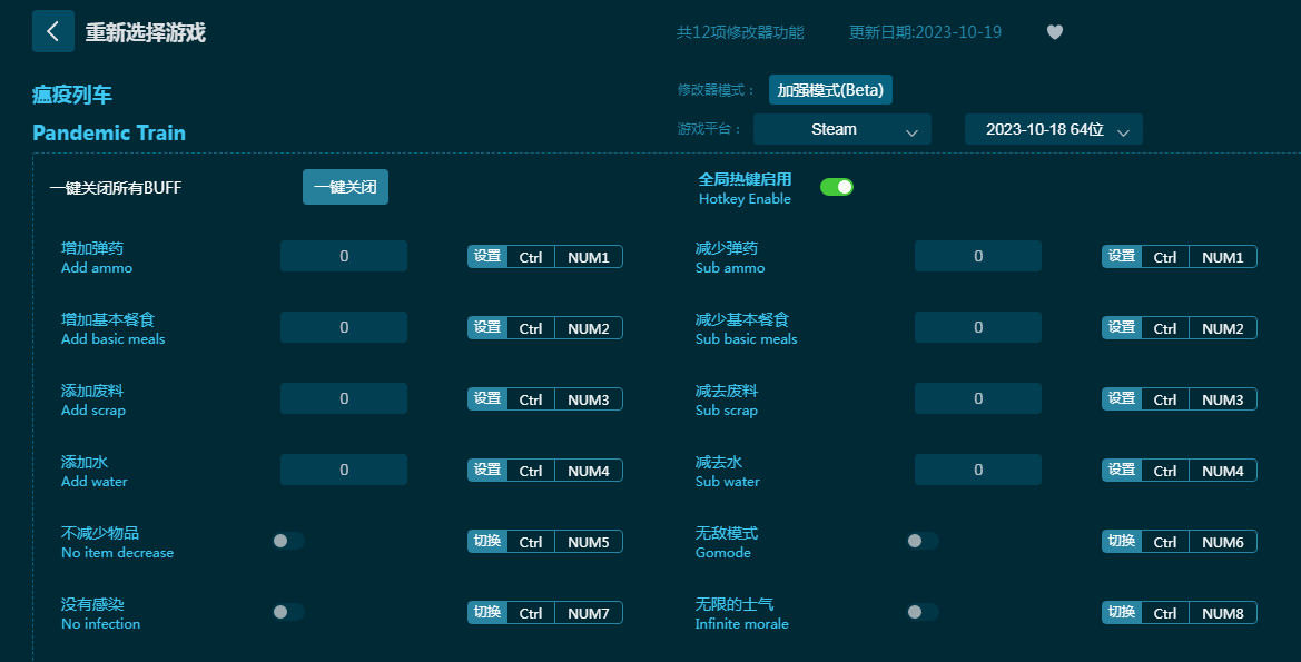 5、等待显示“BUFF加持成功”后,我们就可以在瘟疫列车游戏中使用按键来快速激活和关闭对应的修改器功能了