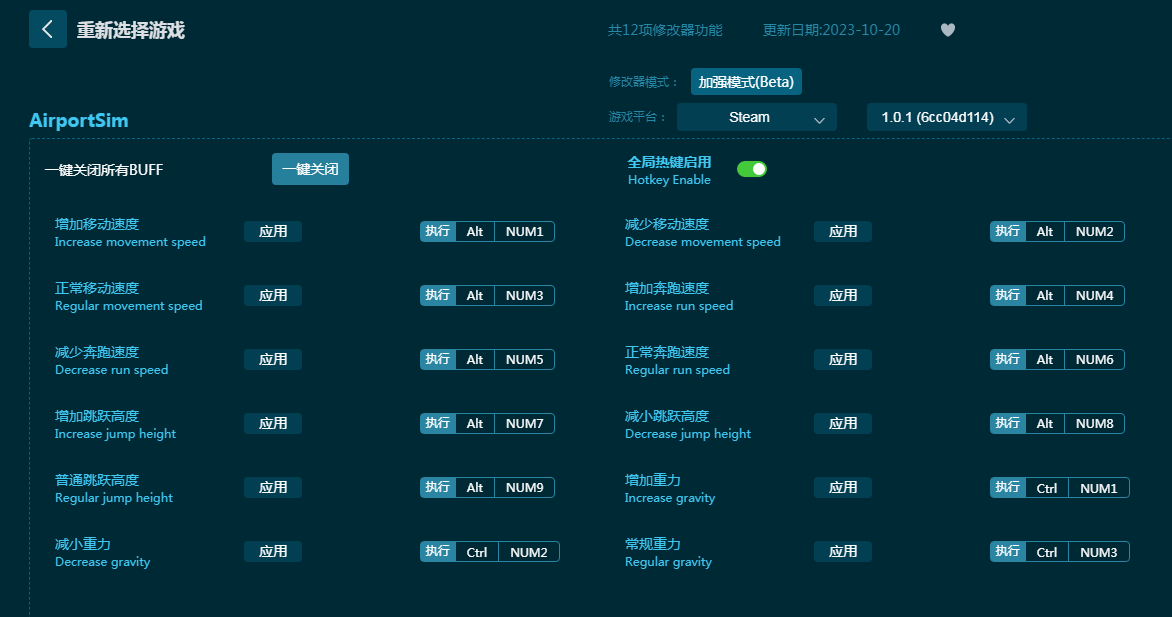 5、等待显示“BUFF加持成功”后,我们就可以在AirportSim游戏中使用按键来快速激活和关闭对应的修改器功能了