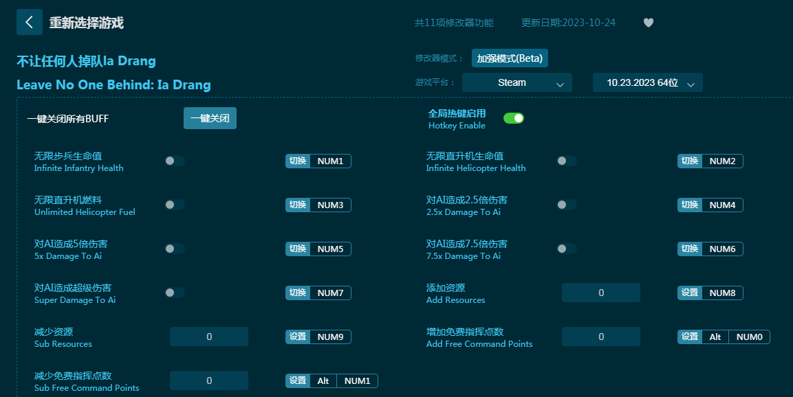 5、等待显示“BUFF加持成功”后,我们就可以在不让任何人掉队La Drang游戏中使用按键来快速激活和关闭对应的修改器功能了
