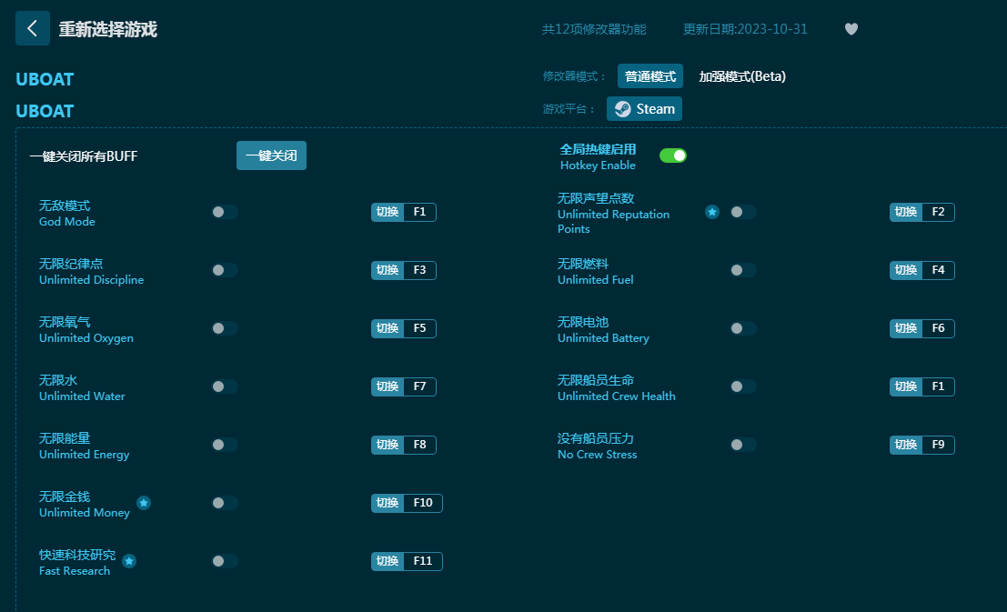 5、等待显示“BUFF加持成功”后,我们就可以在UBOAT游戏中使用按键来快速激活和关闭对应的修改器功能了