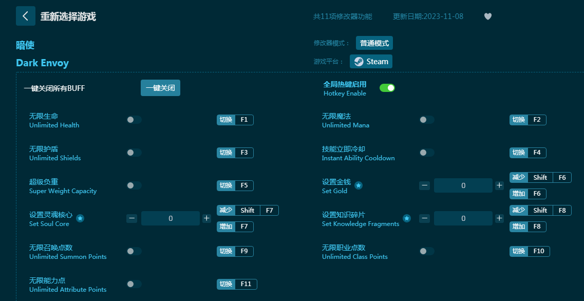 5、等待显示“BUFF加持成功”后,我们就可以在暗使游戏中使用按键来快速激活和关闭对应的修改器功能了