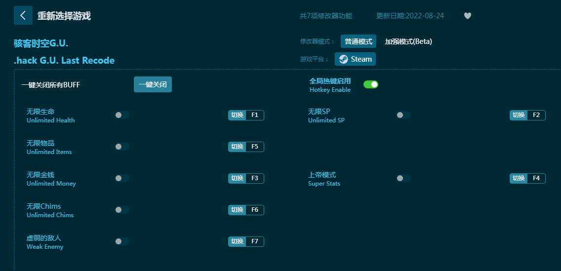 《骇客时空GU修改器》是一款专为游戏《骇客时空GU》玩家们出品的强力免费修改器,内置无限生命,无限物品,无线SP,上帝模式,无限金钱,虚弱的敌人等七项强力功能使用。使用骇客时空GU修改器,能够帮助玩家游戏更轻松,游戏体验更佳!感兴趣的朋友不要错过,六蓝小编推荐大家下载体验!