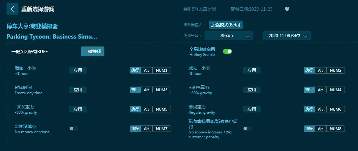 5、等待显示“BUFF加持成功”后,我们就可以在停车大亨商业模拟器游戏中使用按键来快速激活和关闭对应的修改器功能了