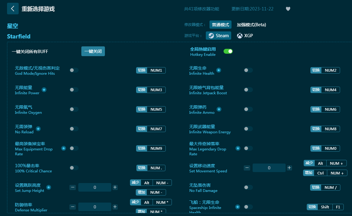 5、等待显示“BUFF加持成功”后,我们就可以在星空游戏中使用按键来快速激活和关闭对应的修改器功能了