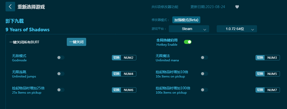 《影下九载修改器》为游戏《影下九载》出品,内置无敌模式,无限连跳,无限魔法,增加拾取物品等六项强力功能使用。玩家使用影下九载修改器,方便简单一键开启关闭,帮助玩家在游戏中战斗更轻松,游戏体验更佳!感兴趣的朋友不要错过,六蓝小编推荐大家下载体验!