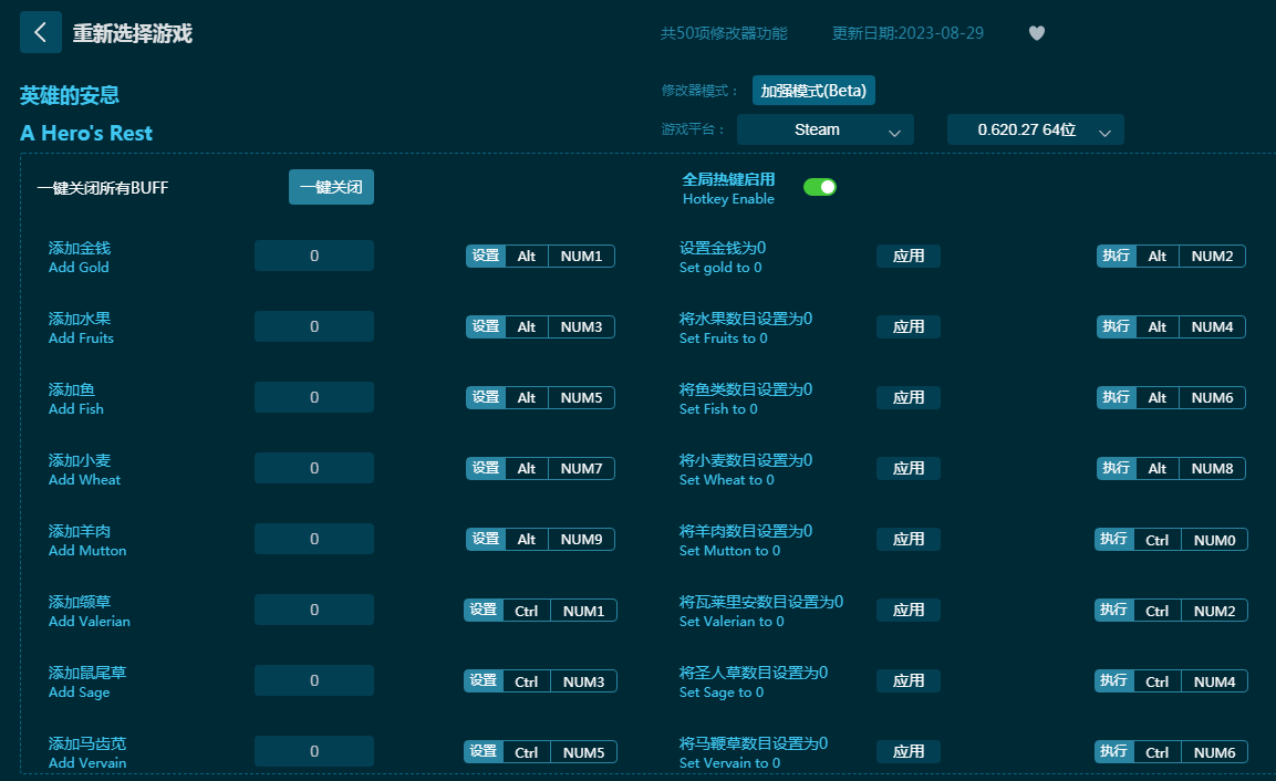 《英雄的安息修改器》内置五十项游戏修改功能,能够满足《英雄的安息》游戏玩家的全部需求。英雄的安息修改器使用免费,提供无限金钱,无限水果,无限鱼,无限小麦,无限羊肉,无限鼠尾草,无限马齿苋等等。丰富功能玩家自由选择,帮助游戏体验更佳!感兴趣的朋友不要错过,六蓝小编推荐大家下载体验!