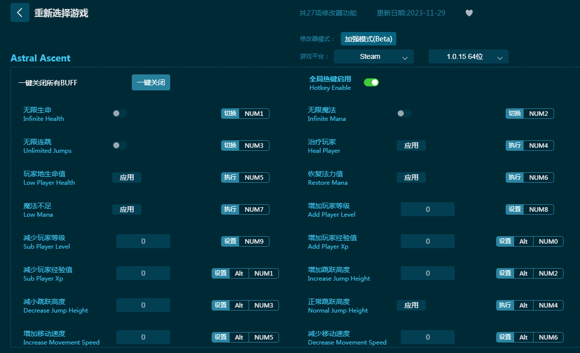 《星界战士修改器》是一款拥有丰富强力游戏修改功能的修改器,为游戏《星界战士》提供二十七项修改功能。玩家下载星界战士修改器可以全部使用,包括无限生命,无限魔法,无限连跳,治疗玩家,恢复法力值,减少等级,增加移动速度等等,你想要的这里都有,满足你的游戏需求!感兴趣的朋友不要错过,六蓝小编推荐大家下载体验!