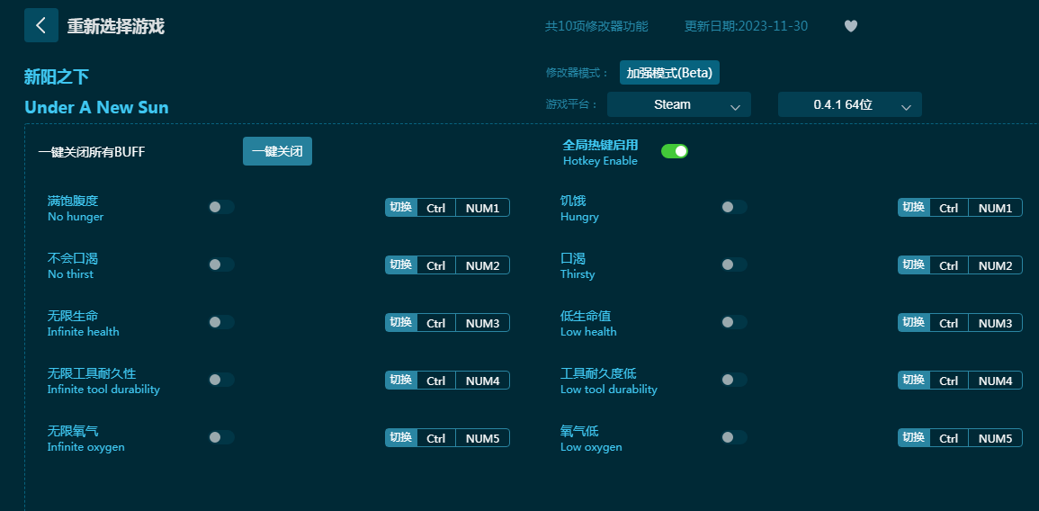 《Under A New Sun新阳之下》是一款最新的荒岛求生游戏,天空出现两个太阳,玩家流落荒岛求生。而这款《新阳之下修改器》专为玩家们出品,提供满饱腹度,不会饥饿,不会口渴,无限生命,无限工具耐久,无限氧气等十项强力功能使用,帮助玩家荒岛求生,游戏体验更佳!感兴趣的朋友不要错过,六蓝小编推荐大家下载体验!