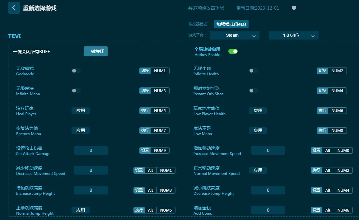 《TEVI修改器》是一款最新的强力游戏修改器为游戏《TEVI》出品。TEVI是一款银河恶魔城冒险新作,兔耳少女带你奇妙冒险。而这款《TEVI修改器》能为玩家提供无敌模式,无限魔法,无限生命,即时发射宝珠,治疗玩家,增加金钱,增加移动速度,增加跳跃高度等三十七项修改功能,帮助玩家降低游戏难度,游戏体验更佳!感兴趣的朋友不要错过,六蓝小编推荐大家下载体验!