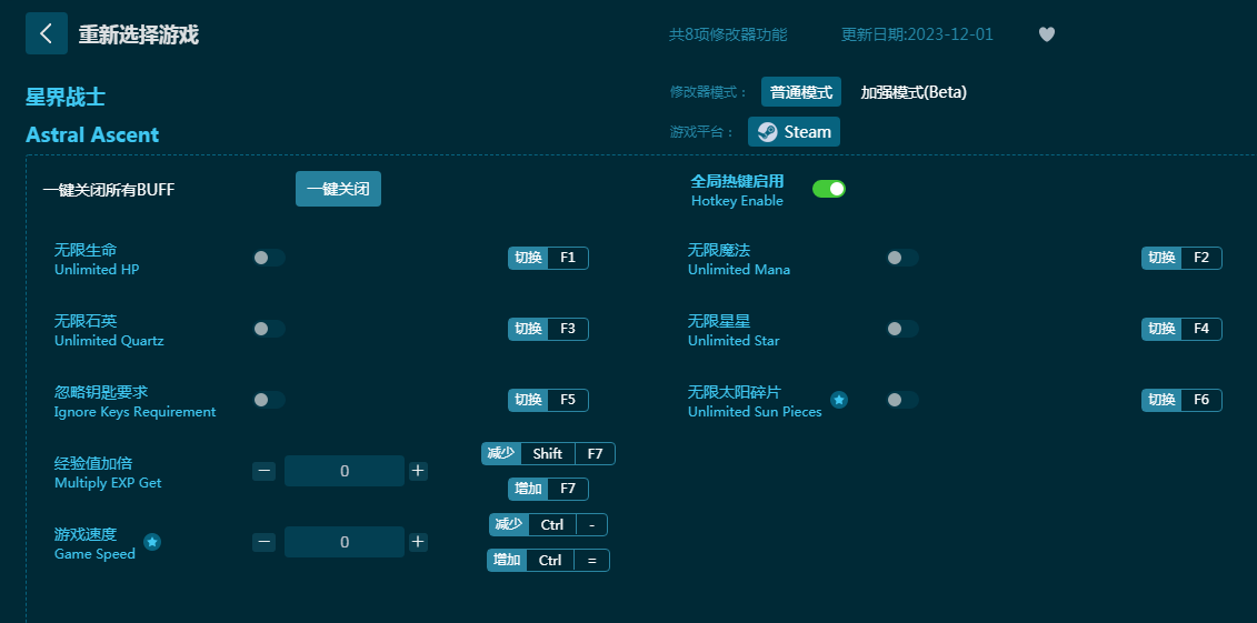 《星界战士》是一款最新的像素横版动作游戏,高难度爽快节奏动作肉鸽玩法。这款《星界战士修改器》能帮助玩家降低游戏难度,提供无限生命,无限魔法,无限石英,无限星星,无限太阳碎片,经验值加倍等八项强力功能。有了星界战士修改器,玩家游戏体验更佳!感兴趣的朋友不要错过,六蓝小编推荐大家下载体验!
