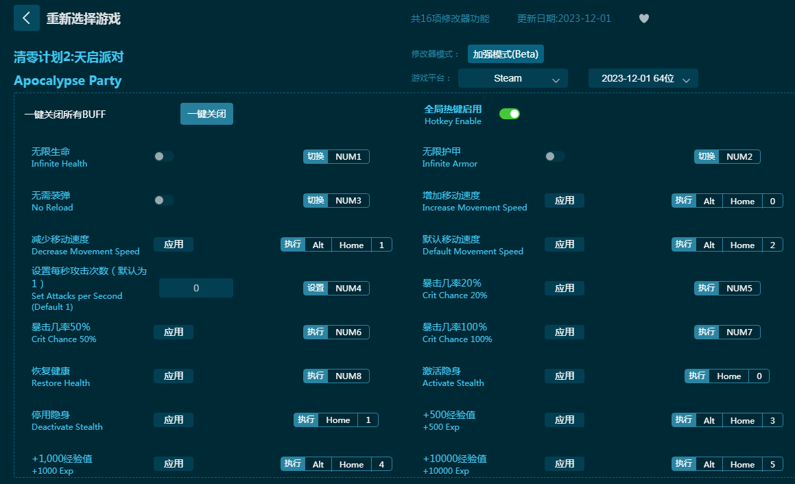 《清零计划2天启派对修改器》是一款专为国产肉鸽新作《清零计划2天启派对》出品的游戏修改器,内置十六项强力修改功能,包括无限生命,无需装弹,无限护甲,增加移动速度,增加暴击,增加经验值,隐身等丰富功能。清零计划2天启派对修改器让玩家在游戏中爽快割草,游戏体验更佳!感兴趣的朋友不要错过,六蓝小编推荐大家下载体验!