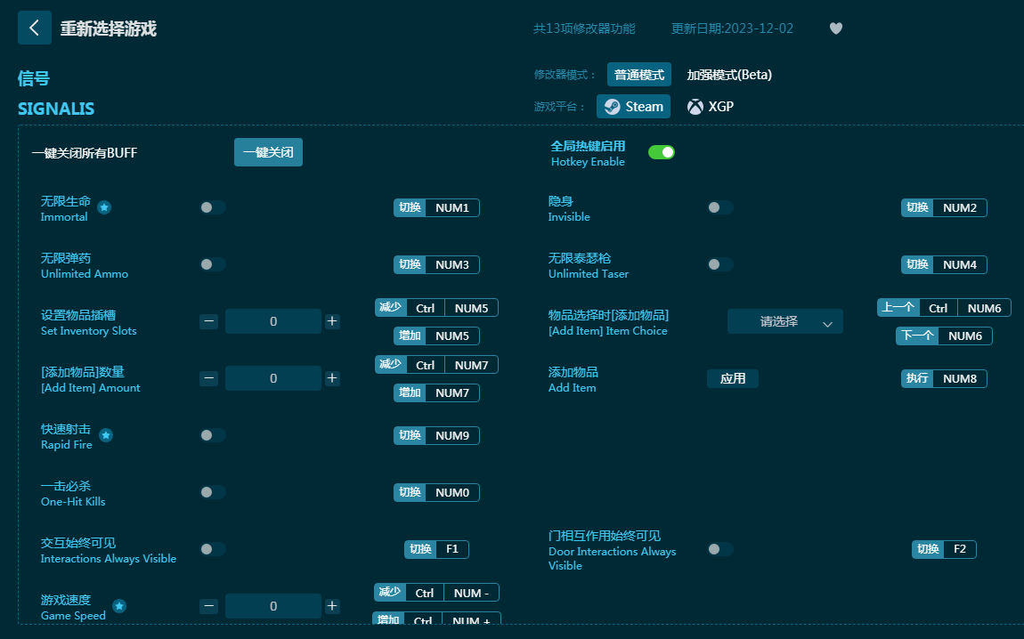 《信号SIGNALIS》是一款非常好玩的剧情科幻恐怖解密生存游戏,体验独特的生存恐怖体验。六蓝小编也为玩家们带来了《信号SIGNALIS修改器》下载,内置无限生命,隐身,无限弹药,无限泰瑟枪,快速射击,一击必杀,添加物品等十三项修改功能。有了这款信号SIGNALIS修改器,玩家游戏更轻松!感兴趣的朋友不要错过,六蓝小编推荐大家下载体验!