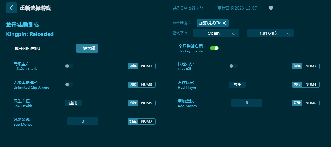 《金并重新加载》是一款经典动作冒险游戏,控制街头帮派进行战斗,现在Steam平台也能玩了。而六蓝小编就为玩家们带来《金并重新加载修改器》下载,内置无限生命,快速击杀,无限剪辑弹药,治疗玩家,增加金钱等七项强力功能。玩家使用金并重新加载修改器,能让游戏更轻松愉快!感兴趣的朋友不要错过,六蓝小编推荐大家下载体验!
