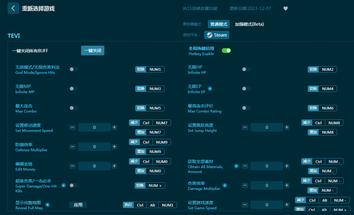 《Tevi修改器》是一款专为游戏《Tevi》出品的游戏修改器,内置十五项丰富游戏修改功能,包括无敌模式,无限HP,无限EP,无限MP,最大连击,防御倍率,伤害倍率,一击必杀等丰富功能。有了这款Tevi修改器,让玩家游戏体验更佳!感兴趣的朋友不要错过,六蓝小编推荐大家下载体验!