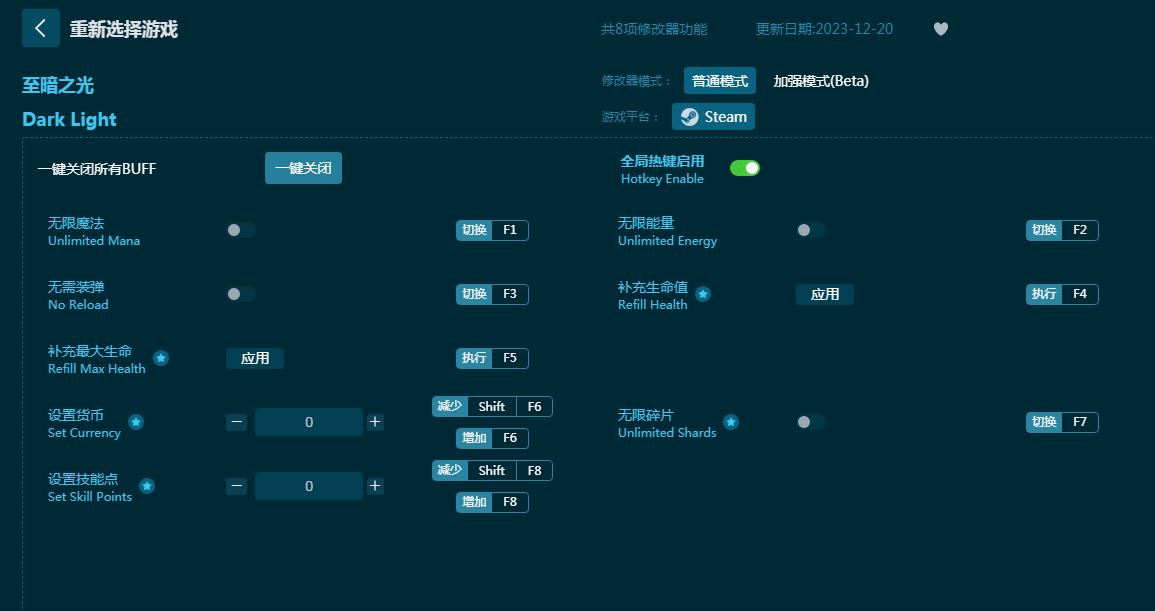 《至暗之光修改器》为硬核2D动作游戏《至暗之光》打造,至暗之光是一款包含魂系列和银河恶魔城类游戏元素的硬核动作游戏。这款《至暗之光修改器》能为玩家们提供无限魔法,无需装弹,无限能量,补充生命值,无限碎片,最大生命等八项强力功能,玩家使用后游戏战斗更轻松爽快!感兴趣的朋友不要错过,六蓝小编推荐大家下载体验!