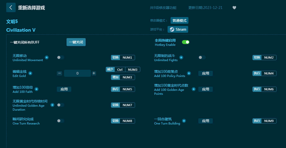 《文明5修改器》专为经典游戏文明系列《文明5》出品,内置九项强力游戏修改器,包括无限移动,无限战斗,编辑金钱,增加信仰,增加建筑点,瞬间研究完成,一回合建筑等等,丰富功能玩家自由选择使用,让游戏更轻松愉快!感兴趣的朋友不要错过,六蓝小编推荐大家下载体验!