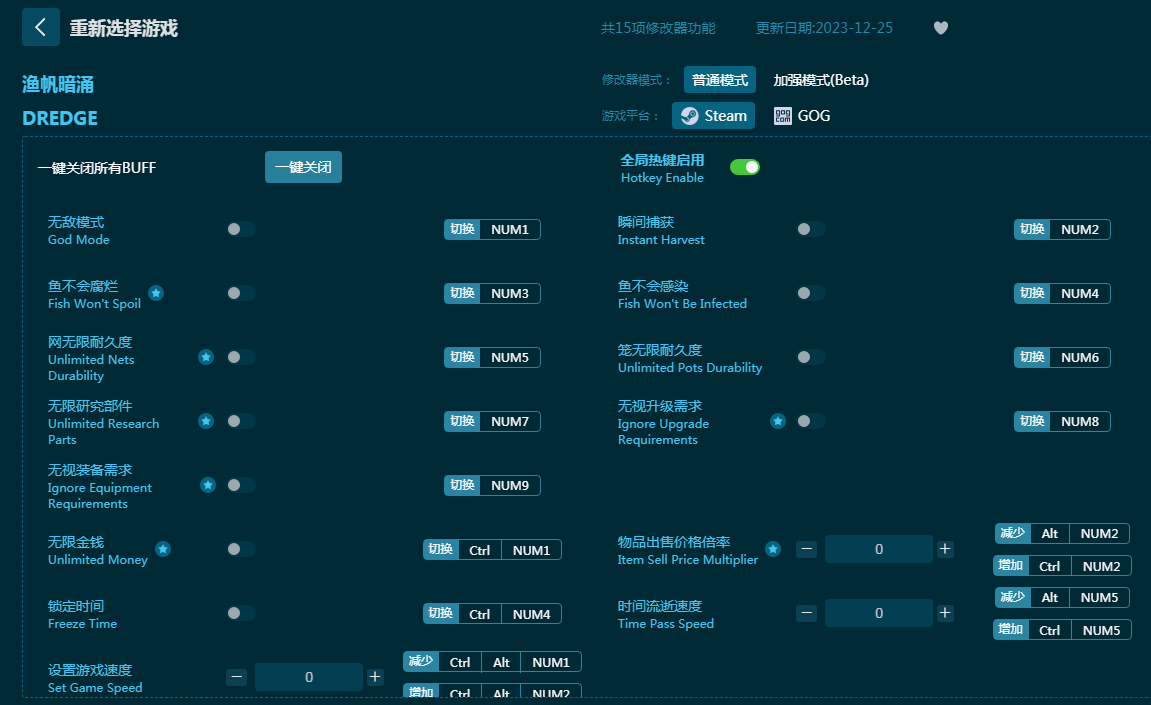 《鱼帆暗涌》是一款克苏鲁风格的单人钓鱼冒险游戏,探索大海里的秘密。这款《鱼帆暗涌修改器》专为玩家打造,提供无敌模式,瞬间捕获,无限腐烂,不会感染,无限耐久,无限研究部件,无限金钱,锁定时间等等。十五项功能自由免费使用,帮助玩家游戏体验更佳!感兴趣的朋友不要错过,六蓝小编推荐大家下载体验!