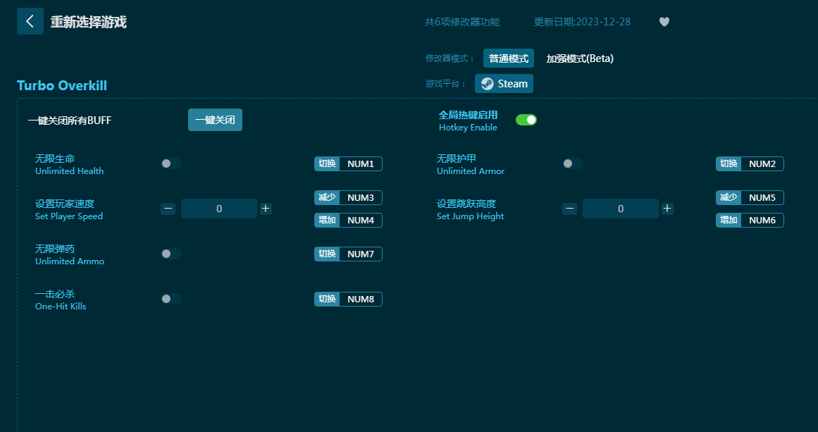 《Turbo Overkill》是一款热门复古射击游戏,超多玩家打出高评分,喜欢射击的朋友不要错过。且六蓝小编为玩家们带来《Turbo Overkill修改器》下载,内置无限生命,无限弹药,一击必杀,无限护甲,跳跃高度等强力功能使用,帮助玩家游戏体验更爽快!感兴趣的朋友不要错过,六蓝小编推荐大家下载体验!