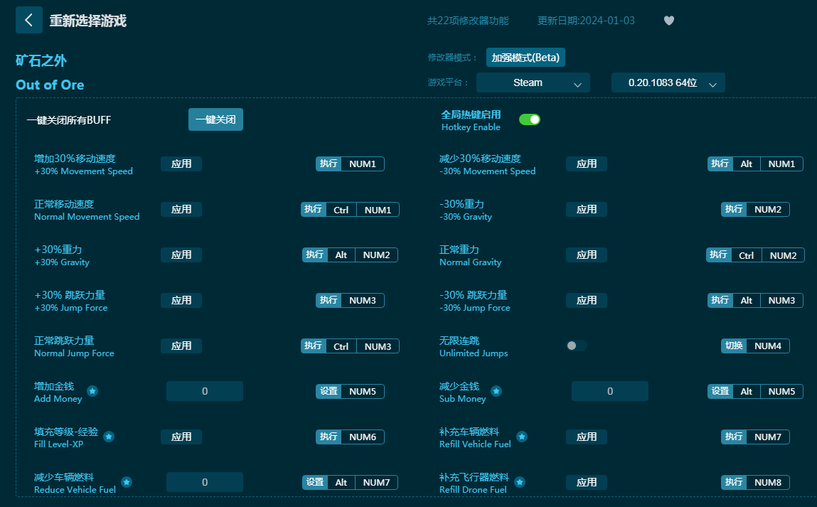 《矿石之外》是一款矿场模拟器游戏,在你的矿场挖掘各种各样的矿物和宝石。这款《矿石之外修改器》能为玩家提供增加移动速度,设置重力,无限连跳,增加金钱,补充燃料等二十二项功能使用。有了矿石之外修改器让玩家挖矿冒险更有趣!感兴趣的朋友不要错过,六蓝小编推荐大家下载体验!