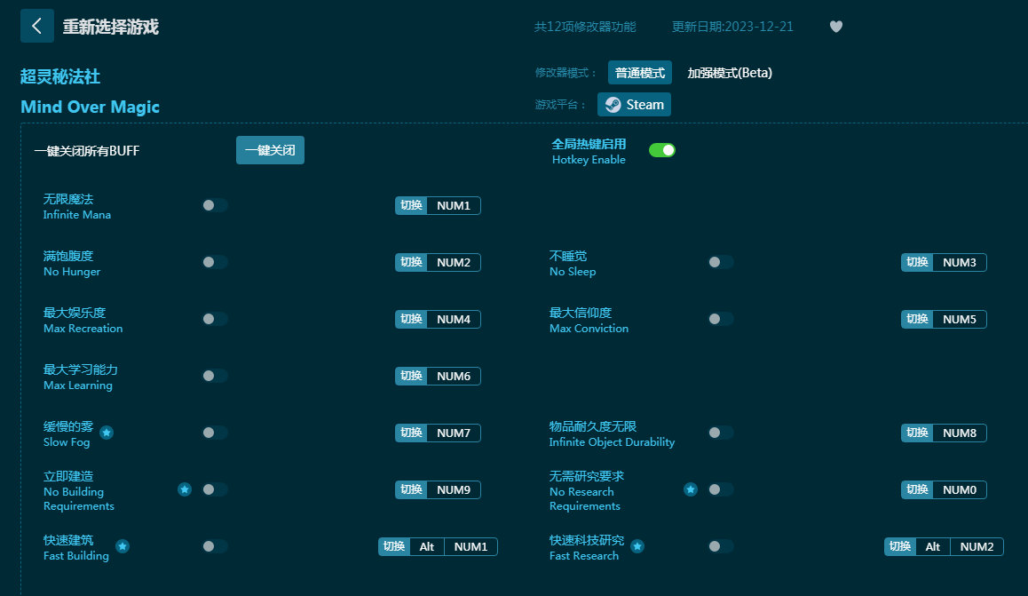 《超灵秘法社》是一款非常热门的魔法沙盒建造模拟游戏,建立你的魔法学院,招收学生一起对抗邪恶雾气。这款《超灵秘法社修改器》能帮助玩家降低游戏难度,提供:无限魔法,满饱腹度,不睡觉,最大娱乐,最大信仰,最大学习,缓慢的雾,立即建造,无限耐久度等丰富功能,免费使用让玩家游戏体验更佳!感兴趣的朋友不要错过,六蓝小编推荐大家下载体验!