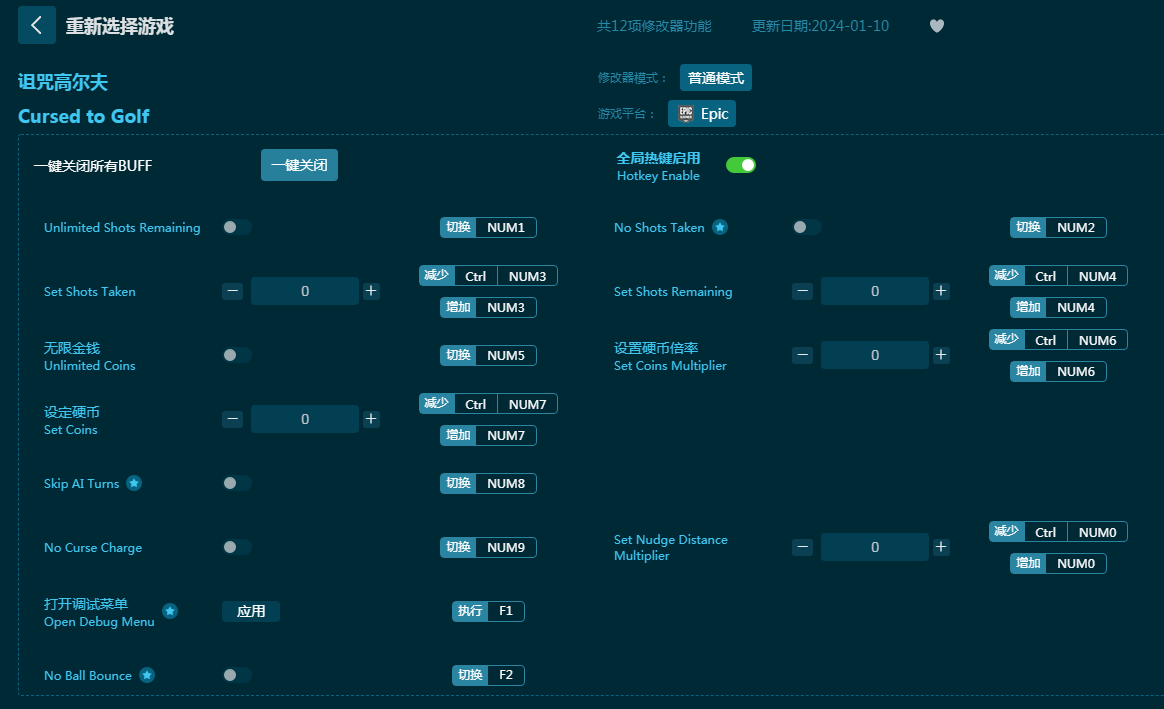 《诅咒高尔夫》是一款非常好玩的肉鸽高尔夫冒险游戏,在异世界打高尔夫冒险。这款《诅咒高尔夫修改器》能为玩家提供无限金钱,无限硬币,硬币倍率,无限生命,无限力量等十二项强力功能使用。有了诅咒高尔夫修改器,帮助玩家快速通关,回到现实世界!感兴趣的朋友不要错过,六蓝小编推荐大家下载体验!