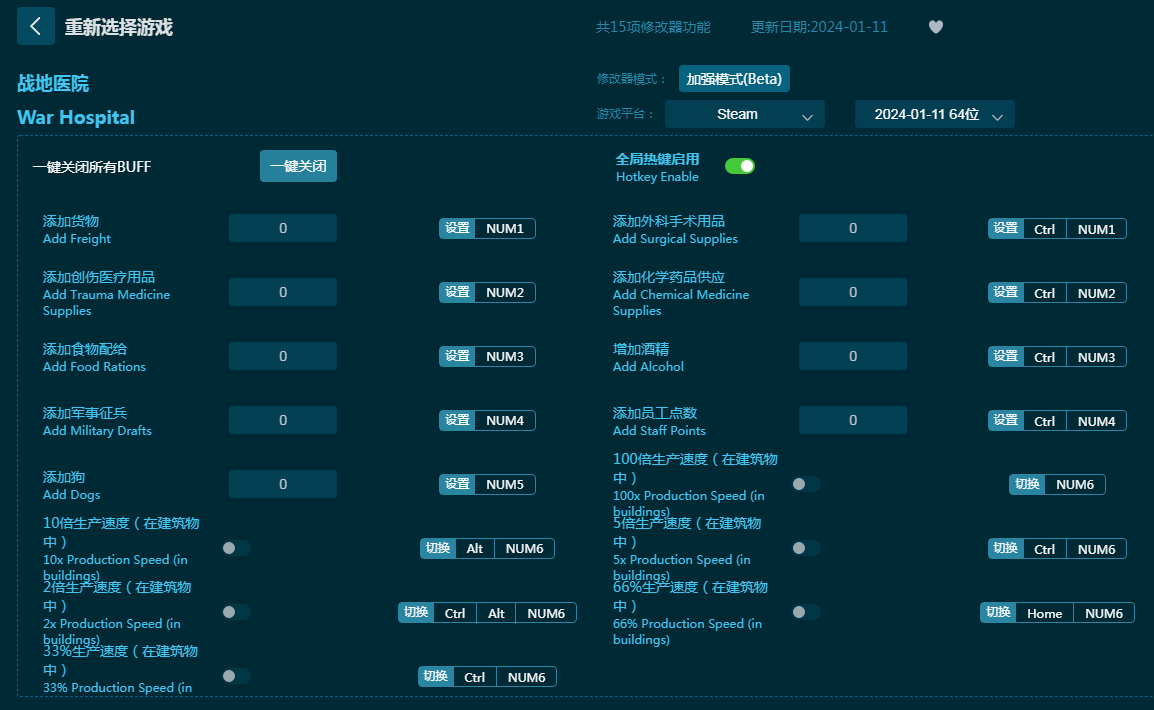 《战地医院》是一款经典的战争游戏,不用直面战争只需救助战争伤员,换个角度见识战争的残酷。六蓝小编带来《战地医院修改器》下载,专为游戏玩家们提供游戏辅助,包括添加货物,添加医疗用品,添加狗,添加酒精,增加食物,增加生产速度等等。十五项游戏辅助让玩家游戏体验更佳!感兴趣的朋友不要错过,六蓝小编推荐大家下载体验!