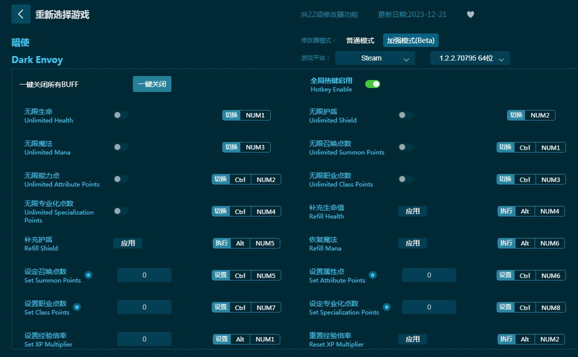 《暗使修改器加强版》专为游戏《暗使》打造专属修改器,提供加强版二十二项游戏辅助。可以让玩家获得无限生命,无限护盾,无限魔法,无限召唤点数,无限能力点,无限职业点数,无限专业化点数等等。丰富功能自由选择,免费使用,让玩家获得更棒的游戏体验!感兴趣的朋友不要错过,六蓝小编推荐大家下载体验!