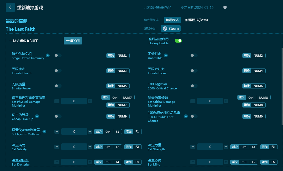《最后的信仰》是一款硬核魂类动作游戏,想要降低游戏难度的玩家可以下载这款《最后的信仰修改器》。最后的信仰修改器能为玩家提供舞台危险免疫,不受打击,无限生命,无限专注力,无限能量,100%暴击,便宜升级,设置力量,设置活力等二十一项辅助功能。有了最后的信仰修改器,游戏轻松通关,各种怪物都挡不住你!感兴趣的朋友不要错过,六蓝小编推荐大家下载体验!