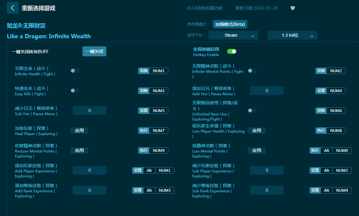 《如龙8无限财富修改器》为大家带来经典如龙系列第八作的游戏辅助工具。为如龙8无限财富的玩家们提供无限生命,无限精神点数,快速击杀,治愈玩家,添加等级等十四项游戏辅助功能。有了如龙8无限财富修改器,让玩家的游戏体验更佳!感兴趣的朋友不要错过,六蓝小编推荐大家下载体验!
