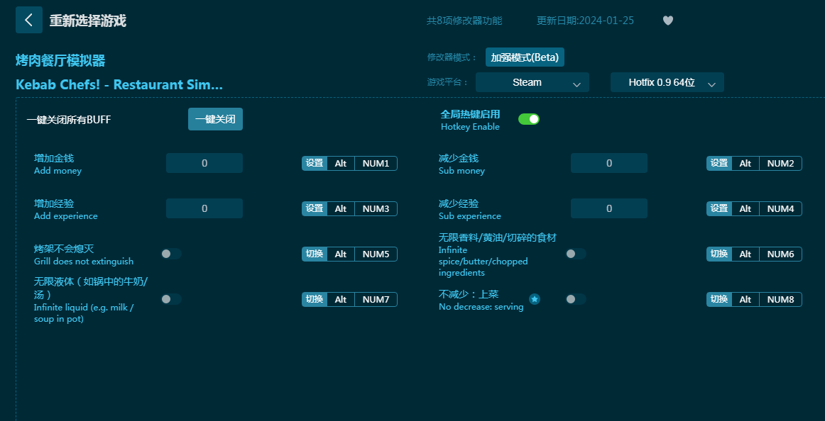 《烤肉餐厅模拟器修改器》是一款专为游戏《烤肉餐厅模拟器》打造的游戏辅助工具。内置八项游戏辅助,包括增加金钱,烤架不会熄灭,无限液体,无限香油等等。下载烤肉餐厅模拟器修改器就能免费使用,玩家游戏体验更轻松愉快!感兴趣的朋友不要错过,六蓝小编推荐大家下载体验!