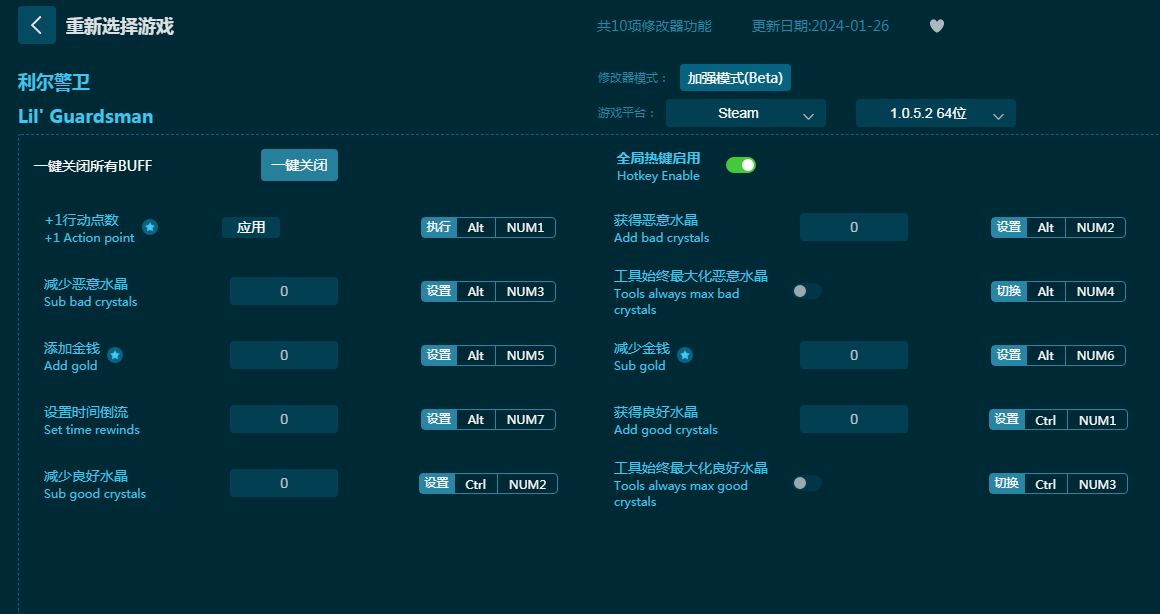 《卫兵利尔》在游戏中当保安,保护城堡平安,非常有趣。这款《卫兵利尔修改器》能让玩家游戏体验更休闲,内置+1行动点数,获得恶意水晶,增加金钱,时间倒流等等十项游戏辅助功能。玩家使用卫兵利尔修改器,让你的游戏冒险更有趣!感兴趣的朋友不要错过,六蓝小编推荐大家下载体验!