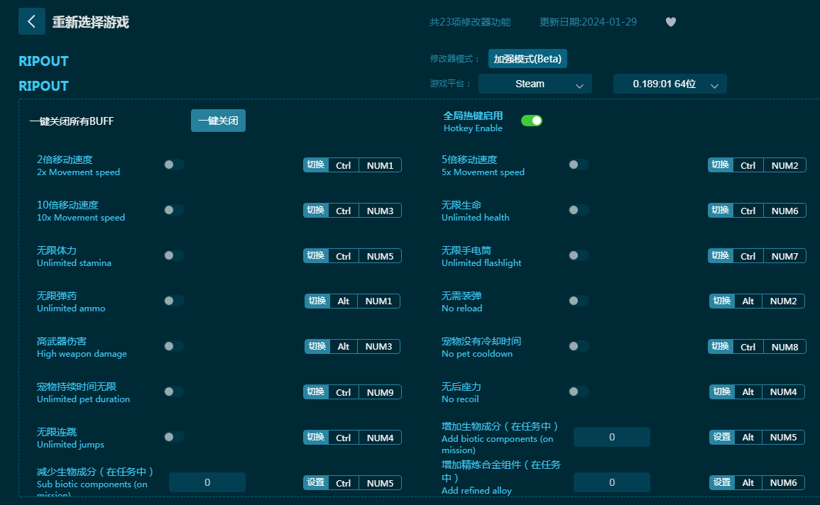 《RIPOUT》是一款多人合作恐怖射击游戏,对战各种变异体努力存活。这款《RIPOUT修改器》能够帮助玩家获得更棒的游戏体验,内置多倍移动速度,无限体力,无限生命,无限弹药,无需装弹,高伤害,无后坐力,无限连跳等二十三项游戏辅助,满足玩家的全部游戏需求,游戏体验更佳!感兴趣的朋友不要错过,六蓝小编推荐大家下载体验!