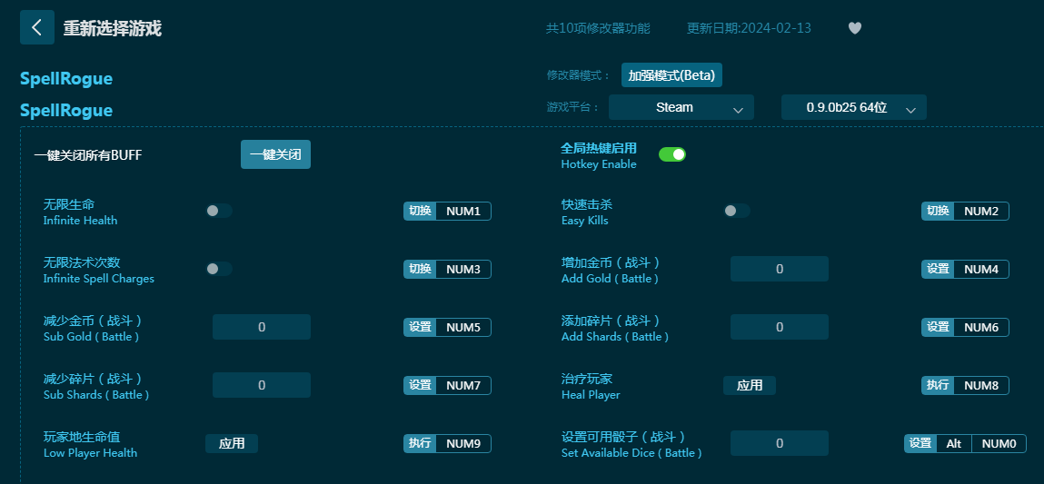 《SpellRogue魔法肉鸽》是一款全新的卡牌魔法肉鸽游戏,体验爽快的肉鸽探索冒险。六蓝游戏网提供玩家《SpellRogue修改器》下载,内置无限生命,快速击杀,无限法术次数,增加金币,治疗玩家,增加碎片等十项辅助功能,帮助玩家魔法肉鸽冒险更轻松!感兴趣的朋友不要错过,六蓝小编推荐大家下载体验!