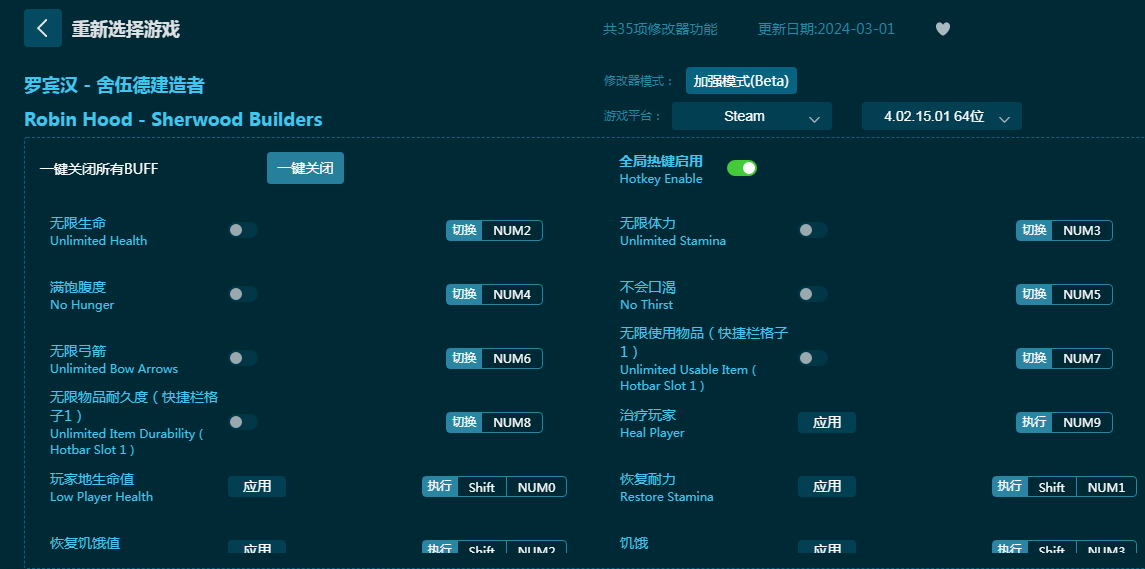 《罗宾汉舍伍德建造者》是一款动作冒险RPG游戏,扮演经典英雄对抗暴政。六蓝游戏网为玩家提供《罗宾汉舍伍德建造者修改器》下载,内置三十五项游戏辅助功能,包括无限生命、无限体力、满饱腹度、不会口渴、无限弓箭、无限使用物品、治疗玩家、恢复耐力等等,全面帮助玩家游戏体验更轻松!感兴趣的朋友不要错过,六蓝游戏网推荐大家下载体验!