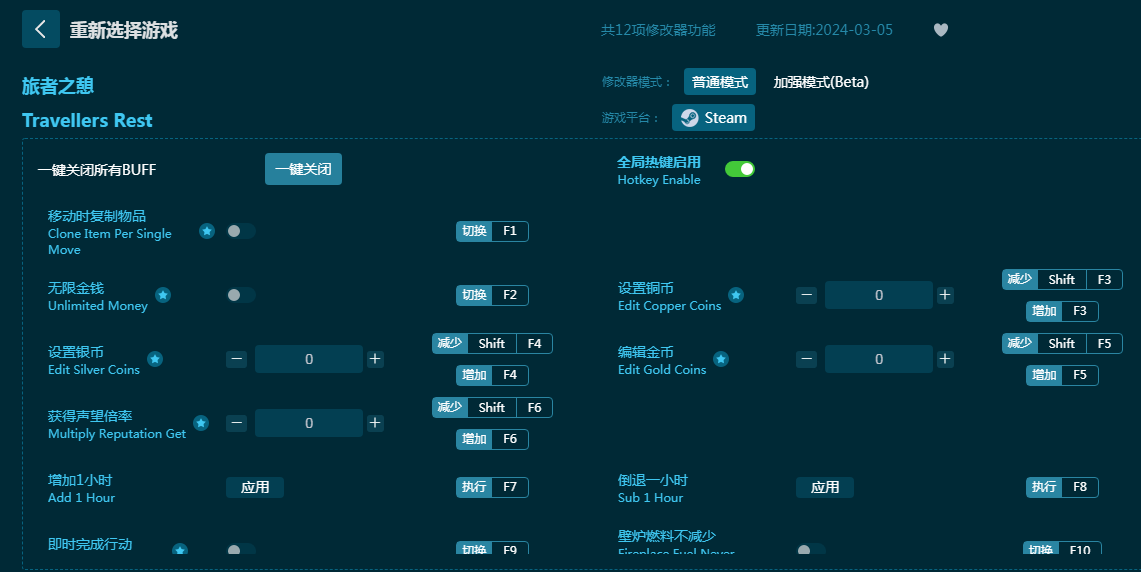《旅者之憩》是一款酒馆模拟经营游戏,成为酒馆老板为来往的客人提供休闲的地方。而这款《旅者之憩修改器》专为游戏设计,内置复制物品、无限金钱、编辑金币、增加时间、声望倍率、完成任务、燃料不减少等十二项丰富功能,有了旅者之憩修改器,玩家的酒馆老板模拟体验更轻松!感兴趣的朋友不要错过,六蓝游戏网推荐大家下载体验!